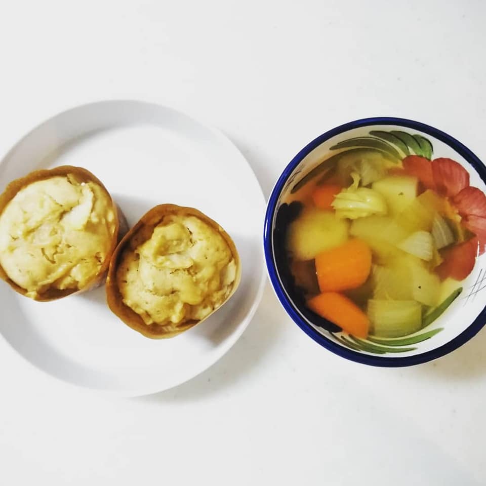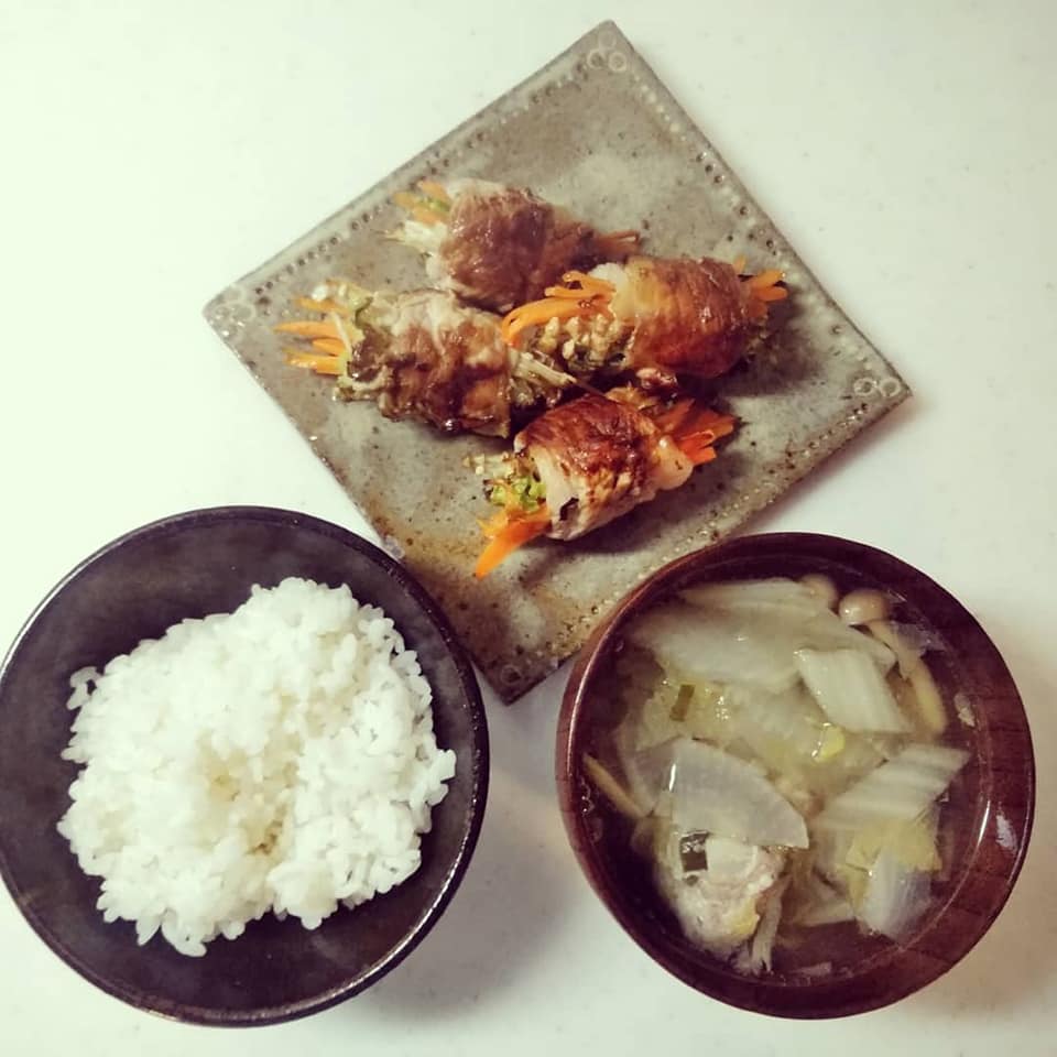 (左)ご飯、白菜大根榎のスープ、豚肉の野菜巻き