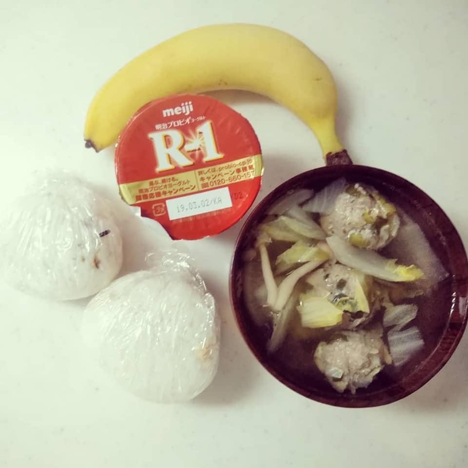 (右)おにぎり、バナナ、ヨーグルト、肉団子と野菜のスープ