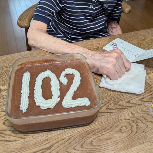 私のおばあちゃん、102歳のお誕生日のお祝いでいただきました。チョコレートプリンが好きだから、チョコレートムースも喜んでくれてうれしかった。